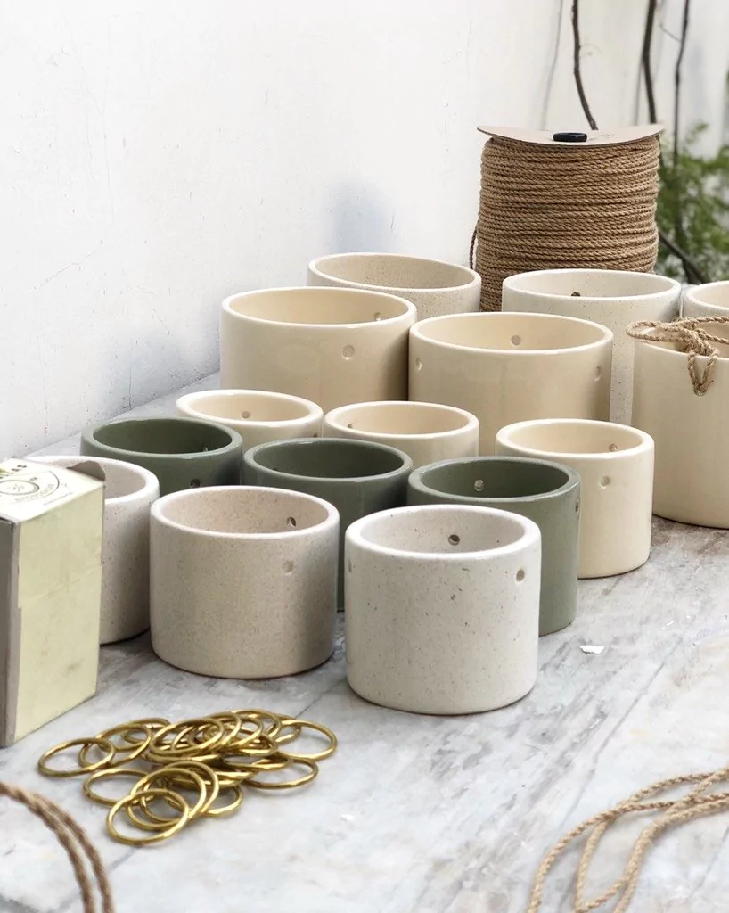 Maceta Colgante de cerámica esmaltada a mano, con 3 tiras de cordón de yute y argolla metálica