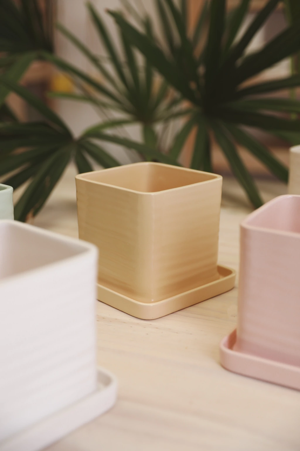 Medidas: Maceta: 13 cm de alto por 12 cm de ancho. Plato: 15 x 15 cm.